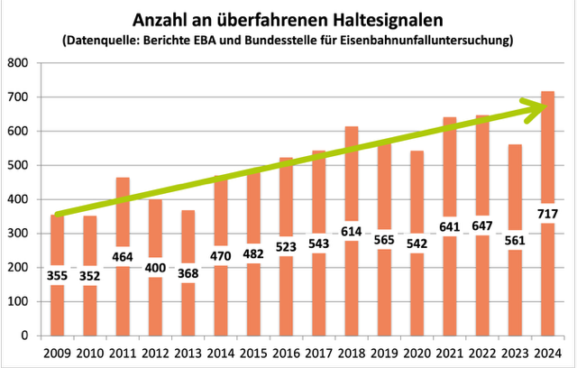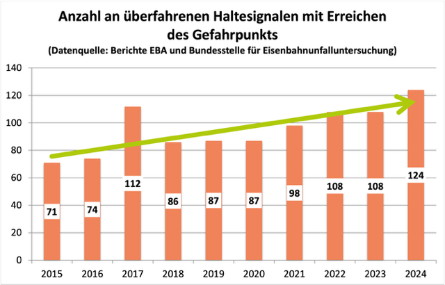 Die Anzahl an überfahrenen Haltesignalen hat 2024 mit 717 Vorfällen einen neuen Höchststand erreicht. Davon erreichten 124 den Gefahrenpunkt – auch das ein neuer Höchststand. Im Vorjahr waren es 561 zu 108. Diese Zahlen hat das Eisenbahn-Bundesamt (EBA) vor Kurzem im Sicherheitsbericht für das Jahr 2024 veröffentlicht. Ein Thema, das mobifair schon lange beschäftigt und aufzeigt, wie wichtig Qualifikation und Aufmerksamkeit im Schienenverkehr sind.