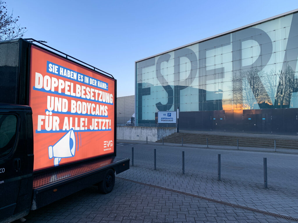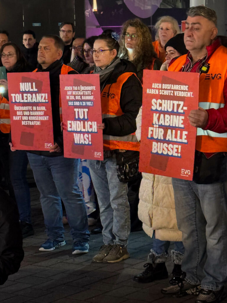 Es war ein wichtiges Signal, das die EVG-Gewerkschafter am Mittwochabend im Vorfeld der Konferenz der Aufgabenträger im Schienenpersonennahverkehr (SPNV) den Konferenzteilnehmern mit einer Kundgebung sendeten. Hintergrund war der tödliche Angriff auf den Zugbegleiter Serkan Çalar vor wenigen Wochen.